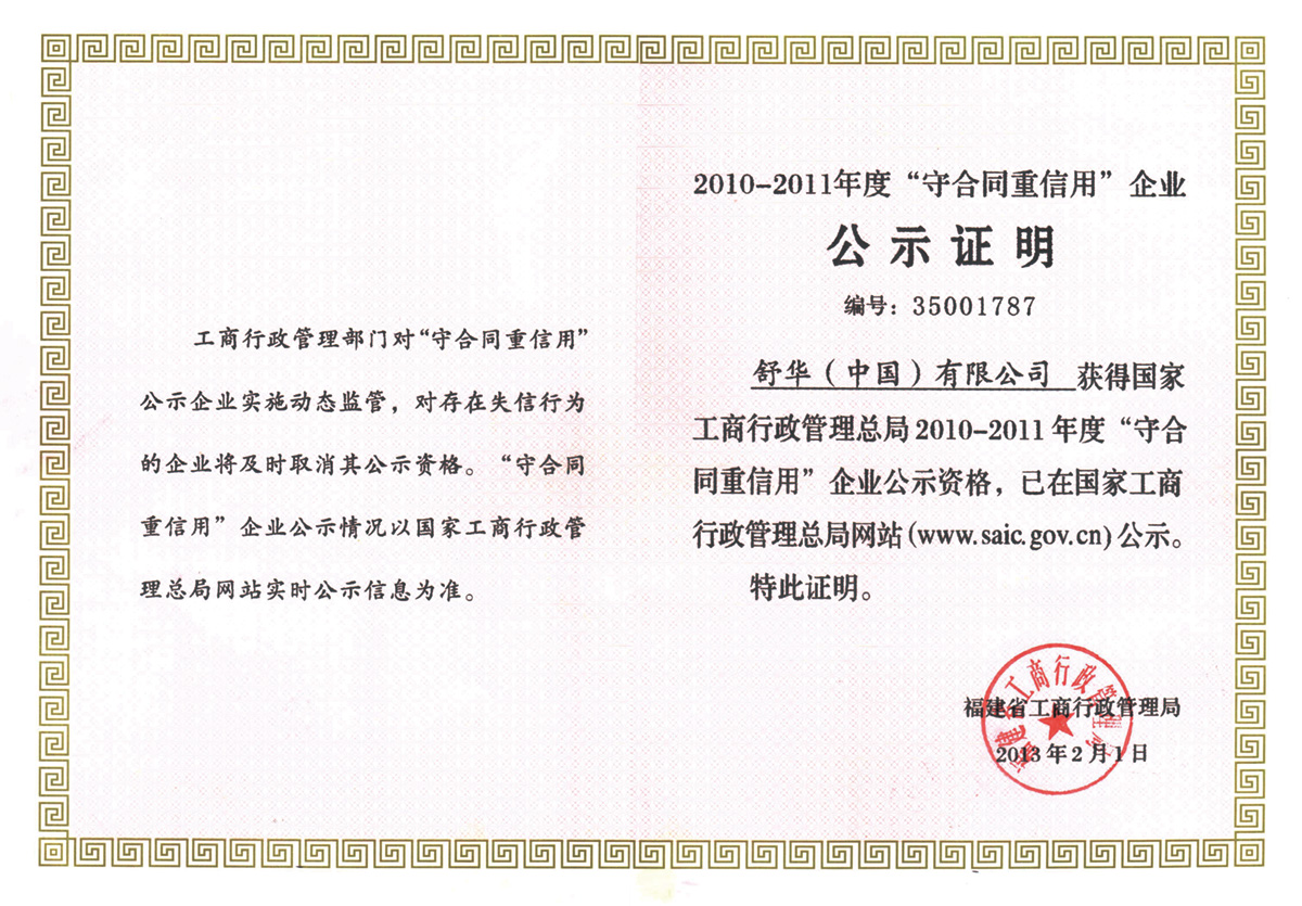 2010-2011 年度国家级“守合同重信用”企业 国家工商行政管理总局 诚信企业 查看