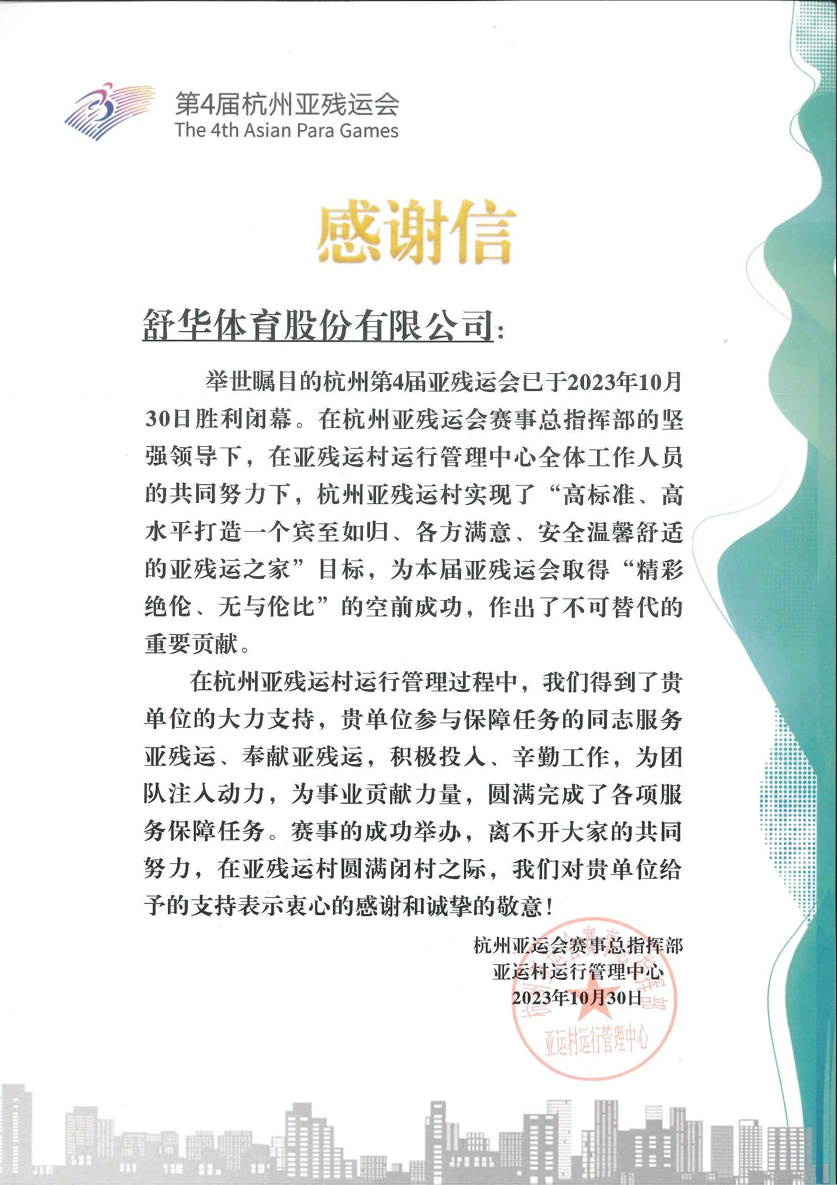 2023 第4届杭州亚残运会感谢信 杭州亚运会赛事总指挥部亚运村运行管理中心 感谢信 查看
