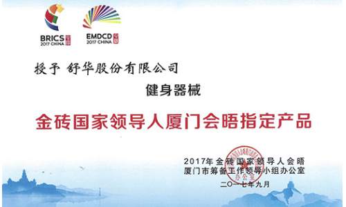 2017年,球速体育健身器材入驻厦门金砖国家领导人会晤,并成为厦门金砖会晤指定健身器械。X6豪华智能家用跑步机荣获中国好设计金奖。 2017, Shuhua fitenss equipment presented itself in Xiamen as the designated fitness equipmentof Xiamen BRICS summit. X6 luxurious home use treadmill won gold award of China Good Design.